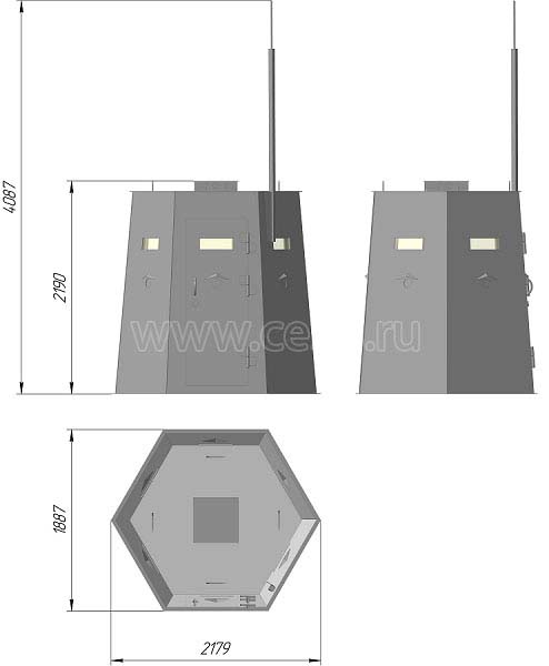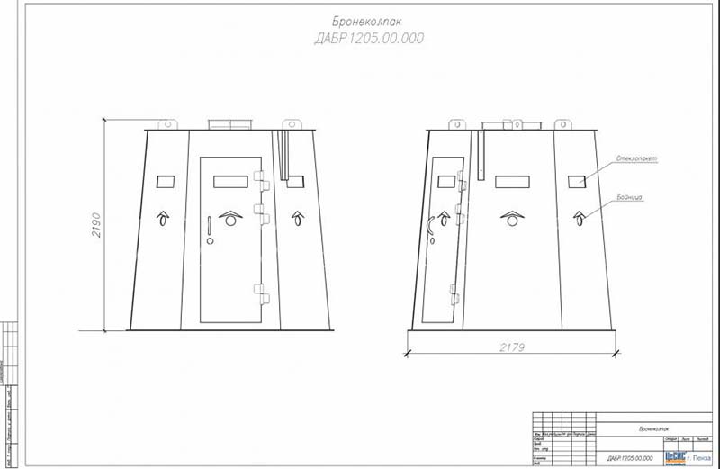 | Габаритные размеры бронеколпака, мм (ДхШхВ) | 2180х1888х2216 (4086 с молниеприемником) |