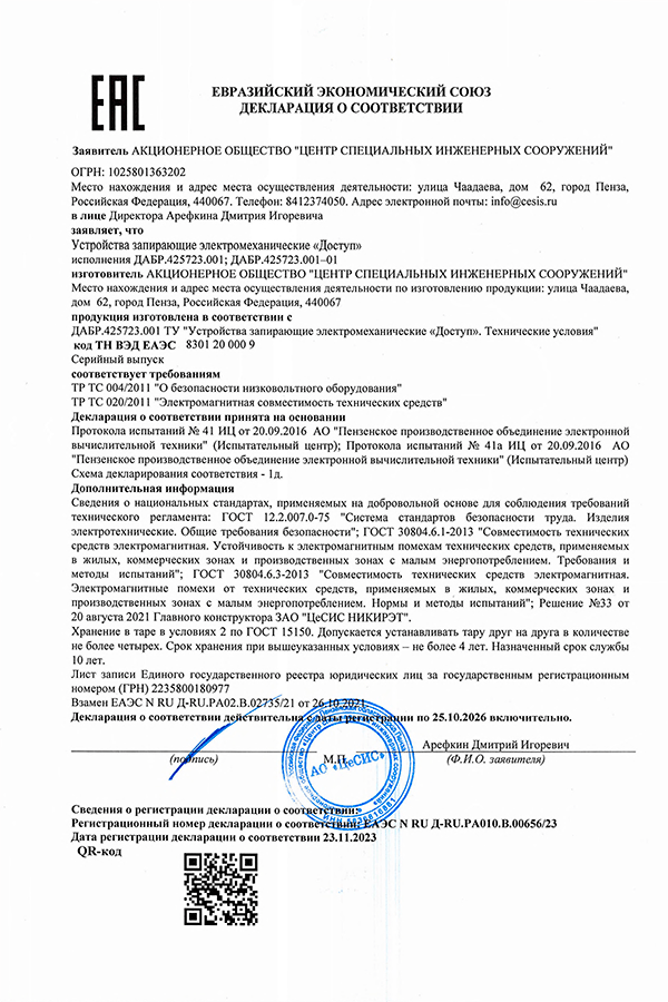 Электромеханическое запирающее устройство ЭМЗУ «ДОСТУП» накладного типа предназначено для установки с внутренней стороны охраняемой зоны на металлические двери, опоры, калитки периметровых рубежей, открывающиеся внутрь или наружу.